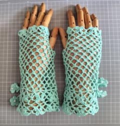 レースのハンドウォーマー ミント ネット編み 花モチーフ ビーズ レース編み