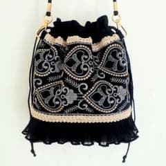 インド刺繍 ポシェット ショルダーバッグ インドリボン 巾着 バッグ 黒