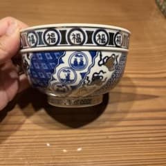 縁起物・「食事に困らないように」青い花柄の陶器茶碗 中型
