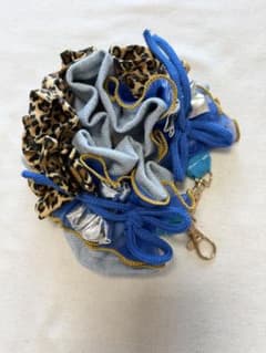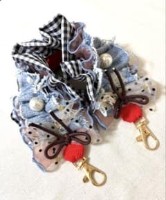 デニム×ブルーふち有フリル ハンドストラップ ヒョウ柄 立体リボン