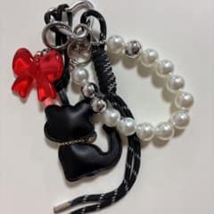 黒猫と赤いリボンの携帯アクセサリー