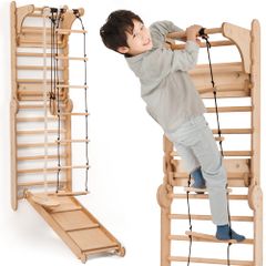 新品 6-in-1 木製スウェーデンウォール&すべり台セット 子供用 多機能クライミングラダー・ブランコ付き 室内遊具 2~12歳向け