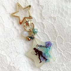 【3815】テニス イエロー星型キーホルダー 群青色とミント色のかすみ草入り