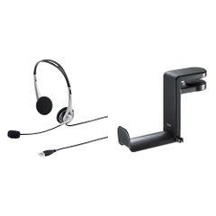 新品 【ヘッドセット+ヘッドホンフック】USBヘッドセット/ヘッドホン 有線 無(全)指向性マイク 軽量 Skype Zoom Teams対応 シルバー MM-HSUSB16SVN + ヘッドホンフック 360°回転 バネ式クランプ PDA-STN18BK