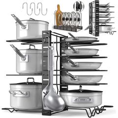 鍋蓋収納 ポットラック シンク下収納ラック フライパン収納(8仕切りフライパンラック)フック3枚付き 省スペース フライパンスタンド 高さ調整可能 鍋収納ラック (ブラック)