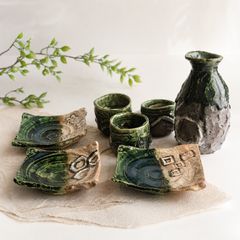 鳴海織部釉酒器セット|片口 1 ・ぐい呑み 3・小皿 3 揃い|手仕事の一点物