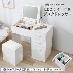 [幅80㎝] LEDライト付きデスクドレッサー 2WAYドレッサーセット 収納スツール付 コスメ収納 鏡台 8601