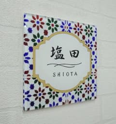 スペインタイル背景アクリル表札*4辺45度斜めカット鏡面仕上げ*UV印刷