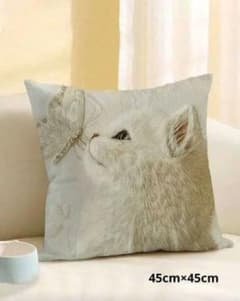 白い猫と蝶のクッションカバー 猫 クッションカバー 刺繍風 45cm×45cm