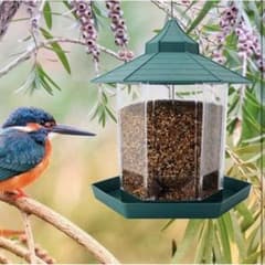 野鳥用透明餌台 六角形 緑色 バードフィーダー 餌箱 吊り下げ
