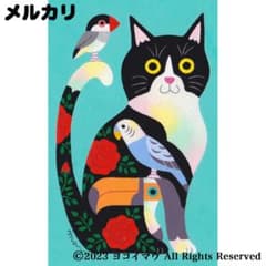 原画「ハチワレ猫と小鳥のポップアート 青緑」猫/鳥/文鳥/インコ/アート/絵画