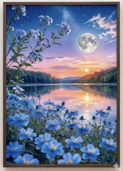 【水彩画風アートプリント】月と夕陽が交差する湖畔の青い花