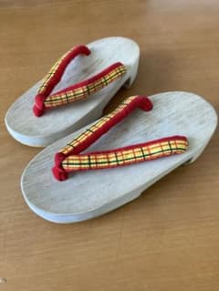 【匿名配送】子供用・木製下駄・赤と黄色のチェック柄鼻緒・未使用品でシミあり