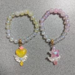 ブレスレット カラフルビーズ 花モチーフ チャーム付 ピンク グリーン 2個