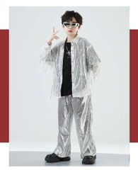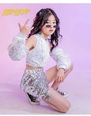ダンス衣装 キッズ 子供用 ヒップホップ セットアップ スパンコール トップス シルバー 銀 パンツ カッコイイ 女の子 ジャズ ダンス 衣装 ジュニア 発表会 派手 目立つ ダンス服 HIPHOP 大きいサイズ 舞台 ステージ