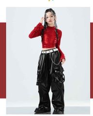 ダンス衣装 キッズ 子供用 ヒップホップ セットアップ 長袖 ショット丈 トップス 黒 ワインレッド パンツ カッコイイ 女の子 ジャズ ダンス 衣装 ジュニア 発表会 派手 目立つ ダンス服 HIPHOP 大きいサイズ 舞台 ステージ