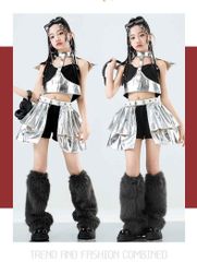 ダンス衣装 キッズ 子供用 ヒップホップ セットアップ 袖なし ショット丈 トップス シルバー 銀 ショット丈 パンツ カッコイイ 女の子 ジャズ ダンス 衣装 ジュニア 発表会 派手 目立つ ダンス服 HIPHOP 大きいサイズ 舞台 ステージ