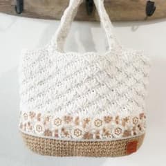 模様編み コットン 麻ひもバッグ かごバッグ インド刺繍リボン ホワイト L