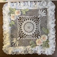 ハンドメイドレース編み。2段フリルと薔薇のスクエア形ドイリーです約26cm角