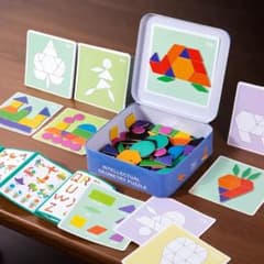 マグネット付タングラム缶ケース付き木製パズル パターンブロック型はめ