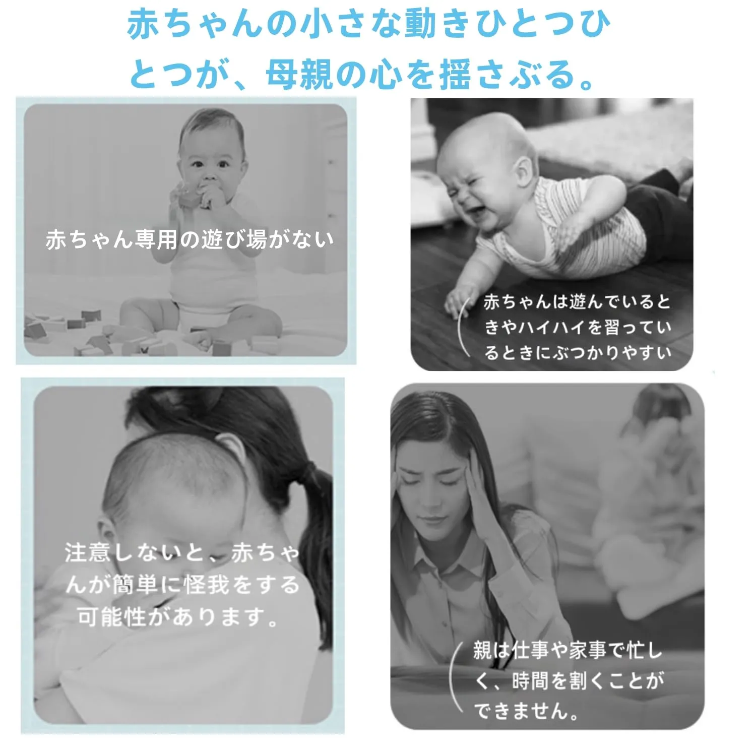 高いメッシュ柵と柔らかい布製素材で、赤ちゃんの転倒や衝突をやんわり受け止めます。保育士の視点から安全性を追求した設計で、親御様が少し目を離す間も、安心して遊ばせられる環境を約束します。すべり止め加工で安定感も抜群。