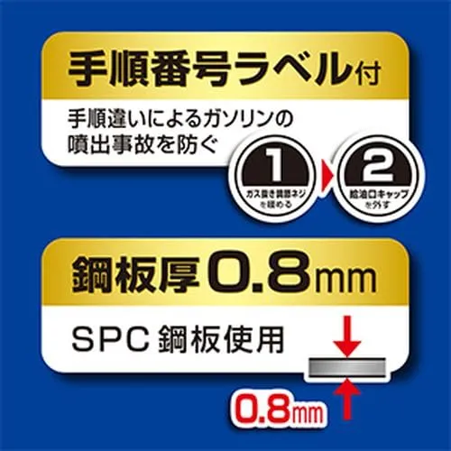 農機や建機などのガソリン補充用に、国際基準(UN)適合、国際基準に基づいた容器性能試験に合格