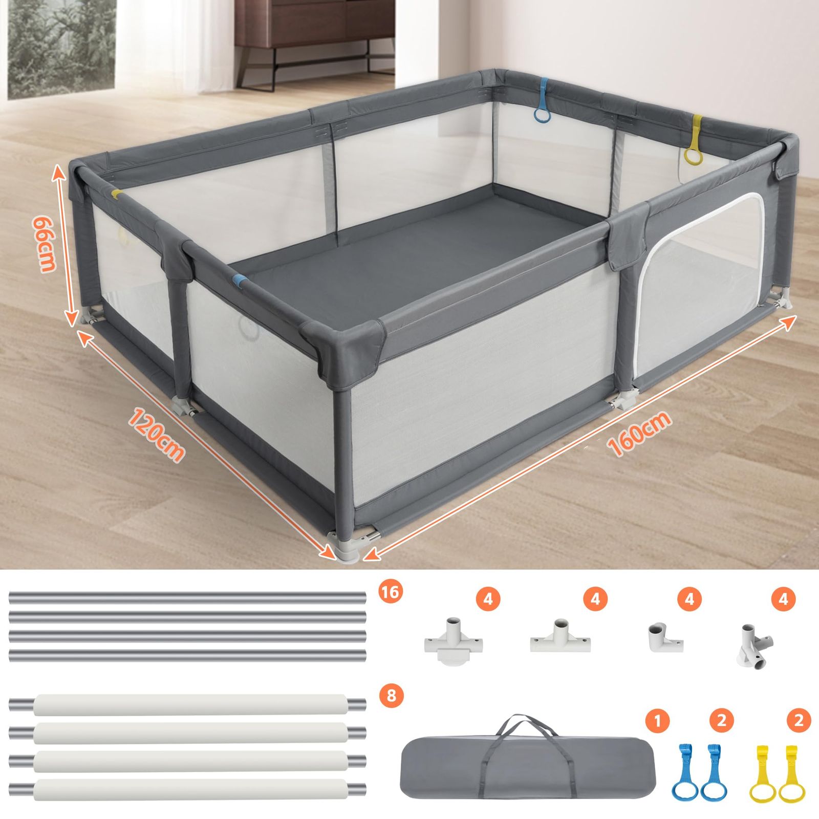 【超大型ベビーサークル】サイズ:120*160*66 cm、色:ダークグレー、本体材料:エコオックスフォード布+合金鋼管+ABSコネクタ、製品重量:約4 kg、適用年齢:生後5ヶ月~4歳頃