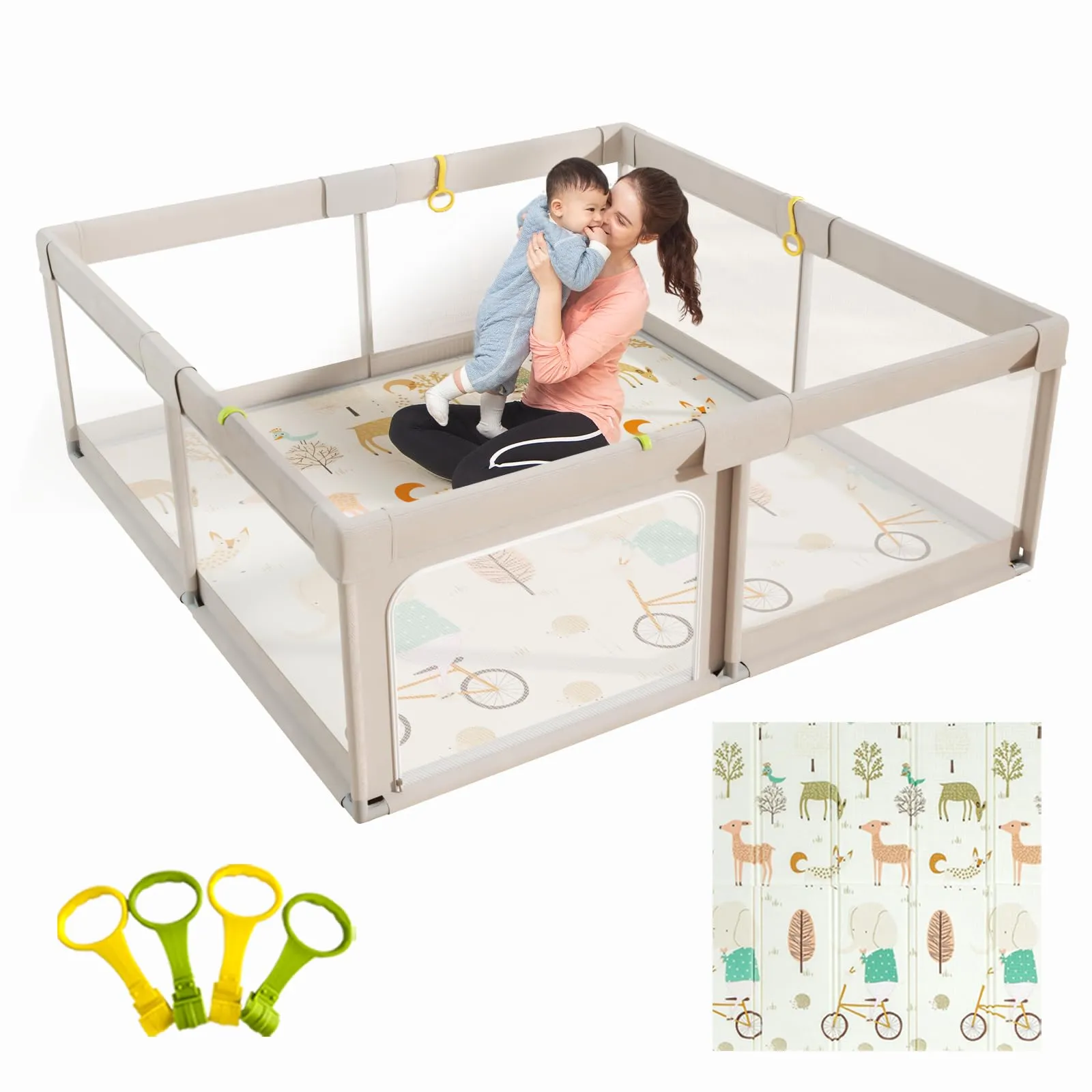 【広い空間で安心安全】このベビーサークルは150×150×65cmで、プレイマット付きです。家事やトイレ・お風呂などで目を離した時に、赤ちゃんに安全なスペースを提供します。メッシュなのでお互いの姿が見れるので親子共々安心できます。