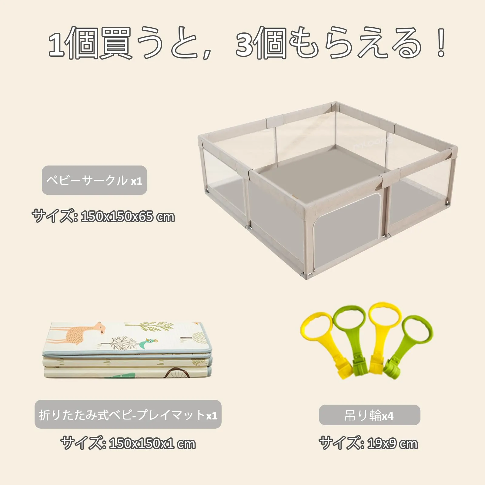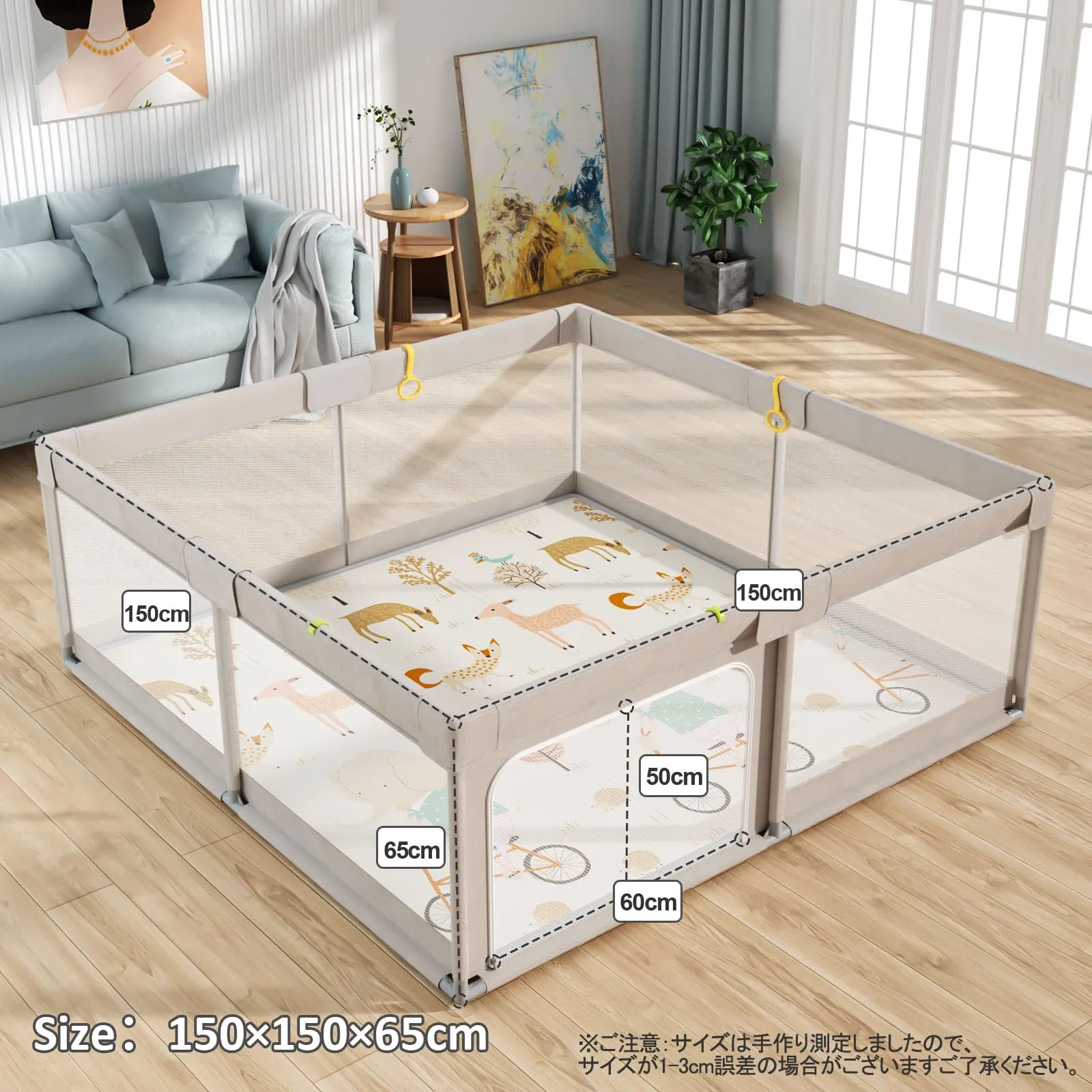 Mloongベビーサークル プレイマット付き 大きめ 赤ちゃん ベビーマット ベビーフェンス 150x150x65cm ベビー プレイヤード サークル 扉付き 日本育児 子供遊び用