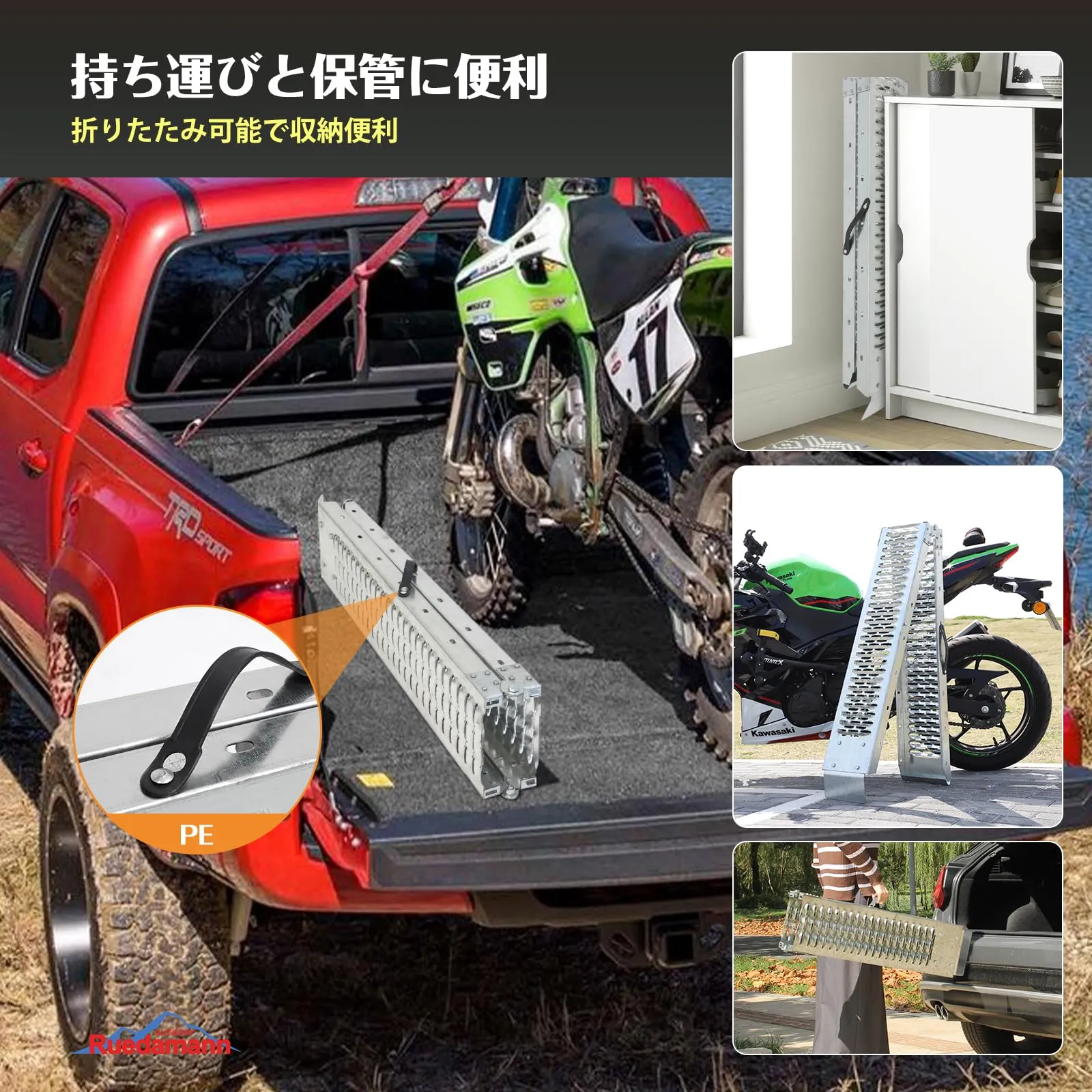 幅広い用途:Ruedamannのラダーは1本使用なら自転車、電動自転車やバイクの積み降ろしに最適です。2本使用すれば、ATV四輪バギー、芝刈り機、除雪機、薪割り機など幅広い機材に対応できます。ガレージや納屋への搬入、軽トラやトラックへの積載など、多用途で活躍するバイクラダーレールです。