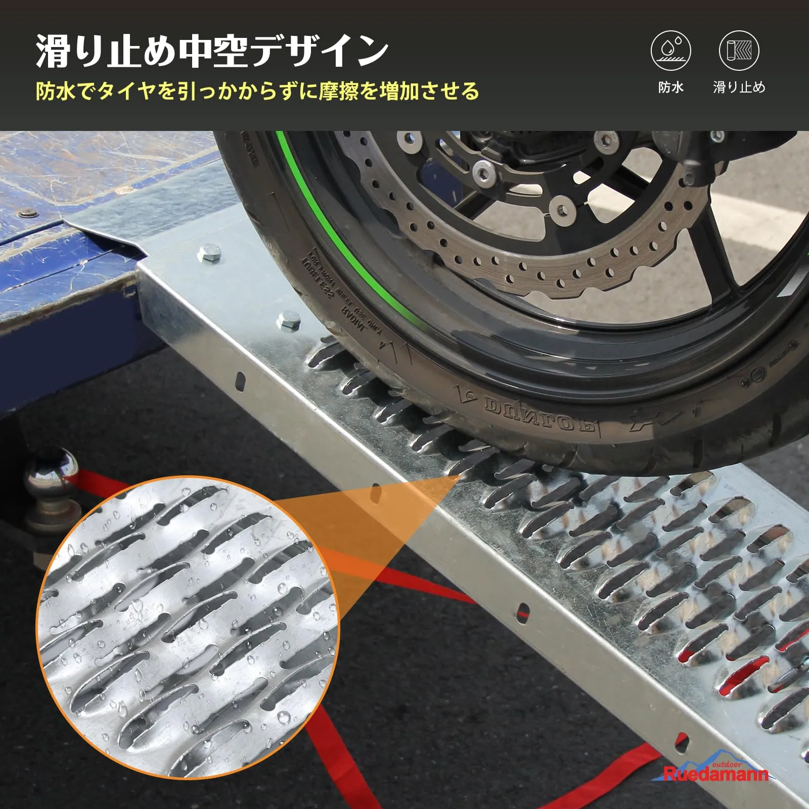滑り止め&安定設計:表面のポンチング穴はタイヤのグリップを高めると同時に雨水を逃がし、滑りにくい設計です。雨天時や悪路でも安心して使用できるバイクラダーです。裏面には滑り止めパッド付きで、ズレを防ぎつつ車体や地面を保護できます。付属のタイダウンベルトでスロープを固定すれば、使用中の安定性が向上します。