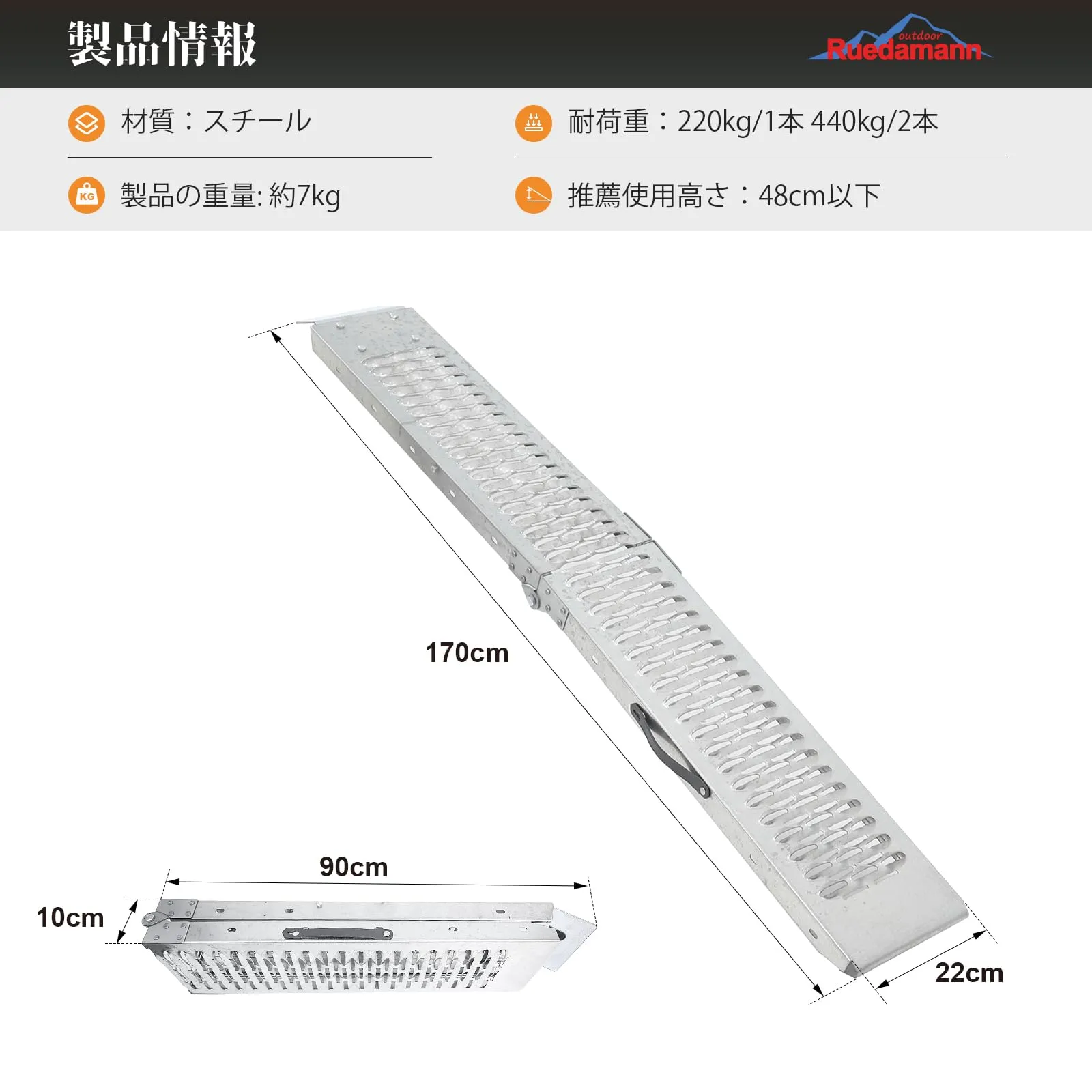 積み下ろしに最適:バイクスロープの展開サイズは長さ170×幅22×高さ4.8cmです。折りたたみサイズ:長さ90×幅22×高さ10cm。推奨使用高さは48cm以下です。ご購入前に、段差の高さをご確認いただくことをおすすめします。