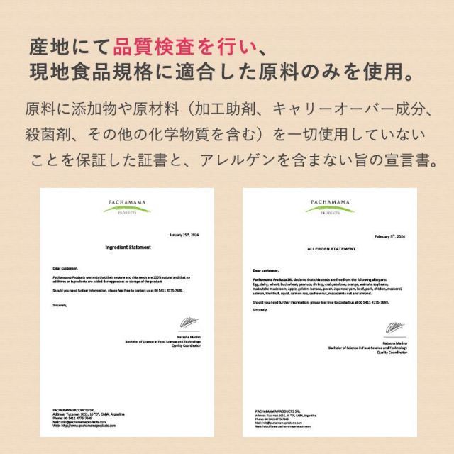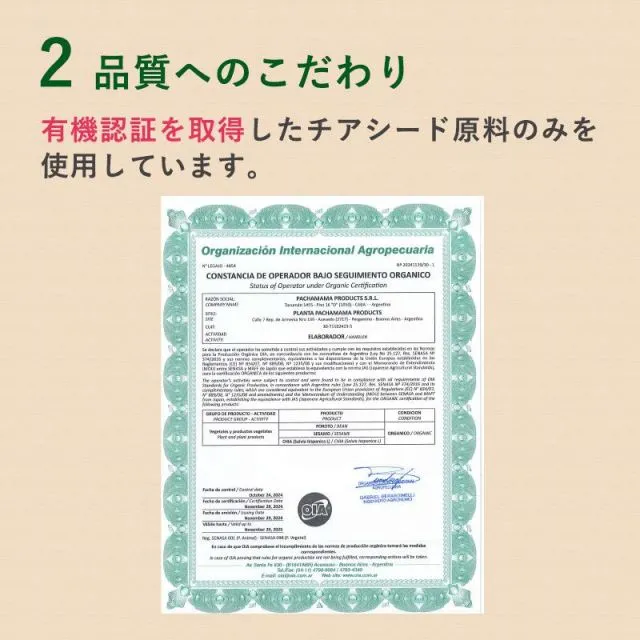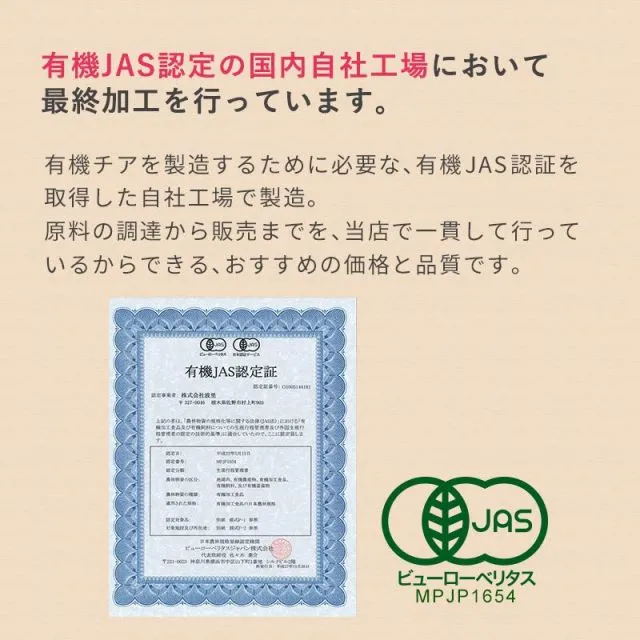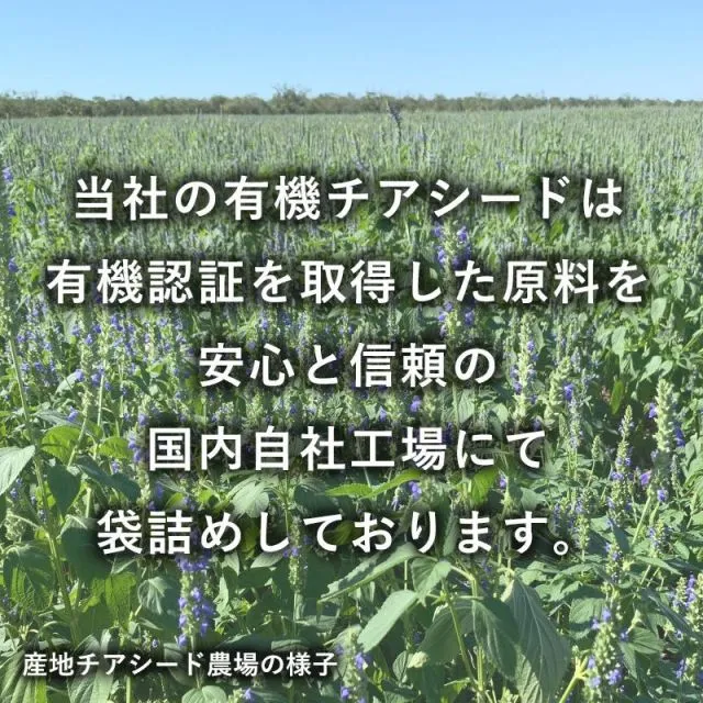 有機認証を取得したアルゼンチン産のチアシードを、安心の有機認証取得の国内自社工場で製品化。
