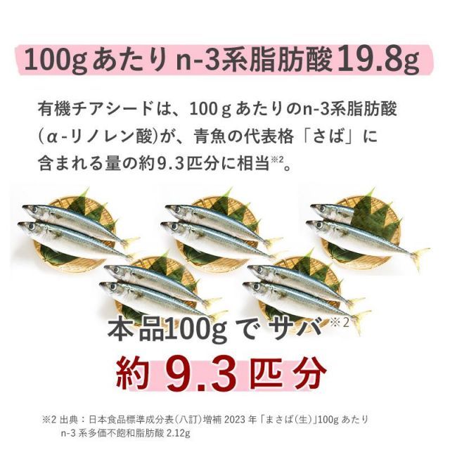なみさとねっとの有機ブラックチアシードは100gあたり食物繊維28.4g、n-3系脂肪酸19.8g、n-6系脂肪酸5.9gが含まれています。