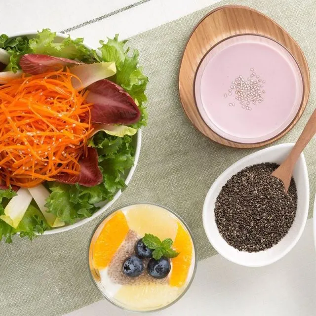チアシードはごまのような見た目をしたほぼ無味無臭の種子です。水分を吸収して10倍以上に膨張し、ゼリー状のトロプチ食感になります。