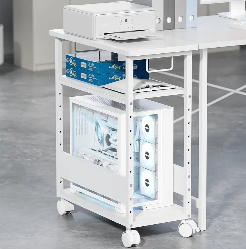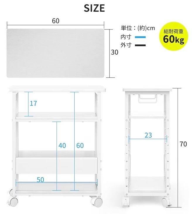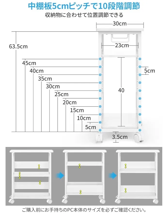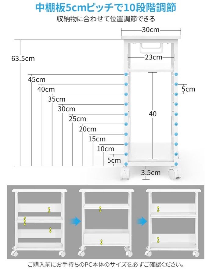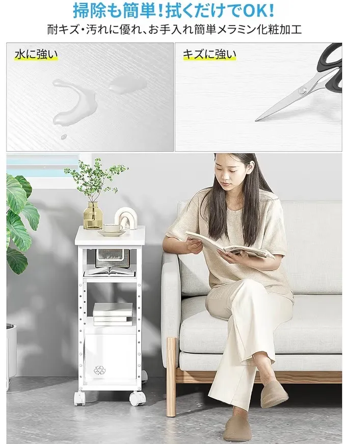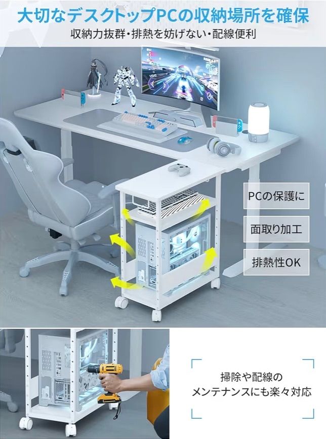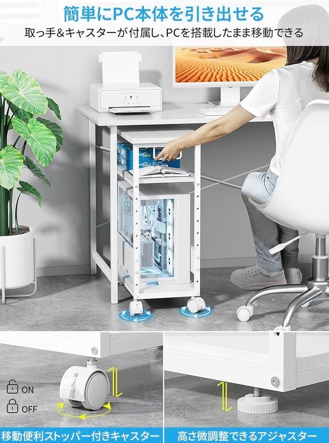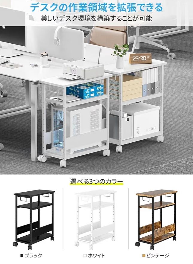 【カラー】 ホワイト 高さ調節に対応した可動棚付き:パソコンワゴンの中棚が可動で、用途に合わせて5cm間隔で9階段高さを調整可能です。収納物に合わせて高さ調節できるので、スッキリ収納することができます。収納空間を絶対無駄に使うわけはないです。 移動に便利なキャスター付き:四つの足に360°回転のキャスターが付いて、ラクラクに移動できて、掃除やメンテナンスに便利です。移動に便利な取っ手も付きます。配線時出し入れがしやすく便利!前2つにはストッパー付き、しっかりと止まって固定できる、デスク滑るのを防ぎ、動がさない時も安心できます。がたつき防止のアジャスターも4つがついており、必要に応じて使い分けが可能。 落下防止&排熱を妨げない設計:CPUワゴンの両側に組み付ける板は、効果的にPCケースがワゴンから地面に倒れ落ちることを防止可能です。開放的な設計で熱がこまりません、CPUに優しいです。充電ケーブルも四方のどこから便利に配線できます。 デスクと合わせて自由で配置可能:配置を変えてデスクの横幅を拡張でき、拡張型のデスクとしてもでき、作業スペースを拡張できます。お使いのデスクの横に設置することでL字テスクにもなります。天板を低めにして、PCを入れて、デスク下にぴったり収まるpcワゴンです。 ※念入りに検品していますが、見逃しがある場合がございます。受取評価後のクレームに関しては対応できかねますので、何かあれば評価前にご連絡ください。