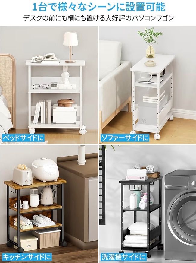 パソコンワゴン PCワゴン 複合機ラック キャスター付き 棚板高さ調節可能 幅60×奥行30×高さ70cm パソコン収納 木製 デスクサイド