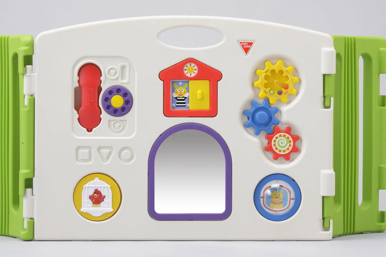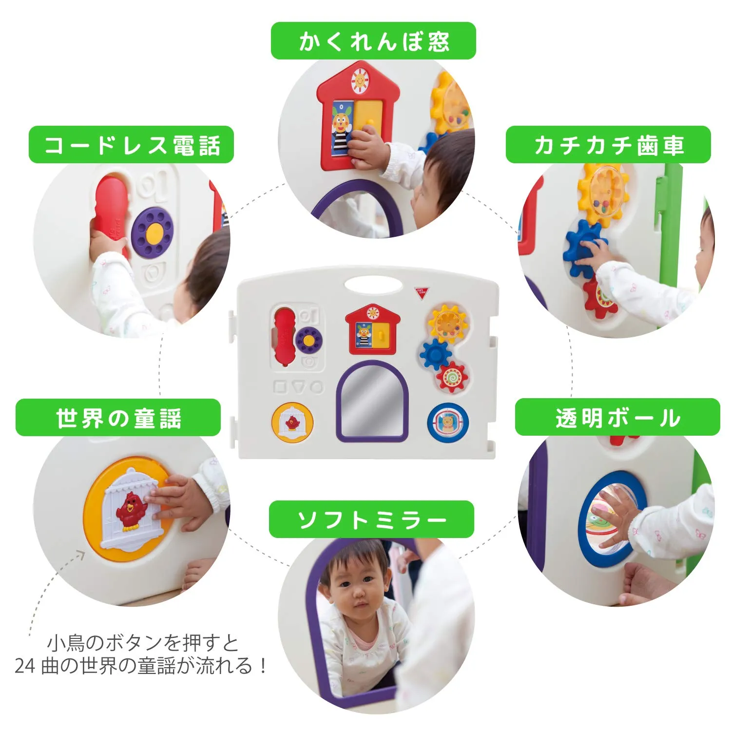 おもちゃパネルには楽しい仕掛けがいっぱい(コードレス電話でママにコール、窓を動かしていないいないばー、3つ同時に回転する歯車、くるくる回る透明ボール、赤ちゃんが大好きな大きなミラー、小鳥のボタンを押すと世界の童謡(24曲)が流れます。)