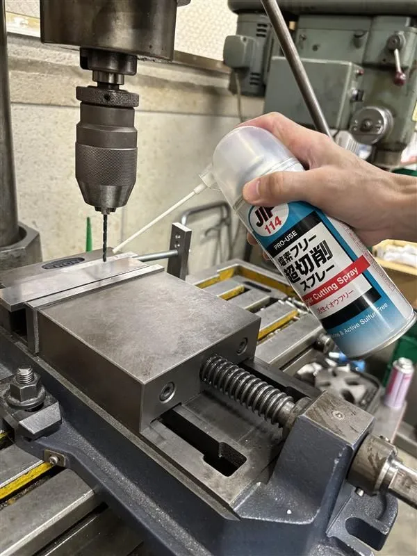 ◆使い方 加工物の準備:加工する工具やワークを準備します。 スプレーの塗布:加工を開始する前に、スプレー缶をよく振り、スプレー先端を加工物または切削工具の刃先(切削する部分)に向けて直接数回スプレーします。 加工:その後、通常通り切削加工を行います。 加工中の追加:加工中に工具やワークが高温になってきたら、適宜追加スプレーをして潤滑と冷却を続けます。