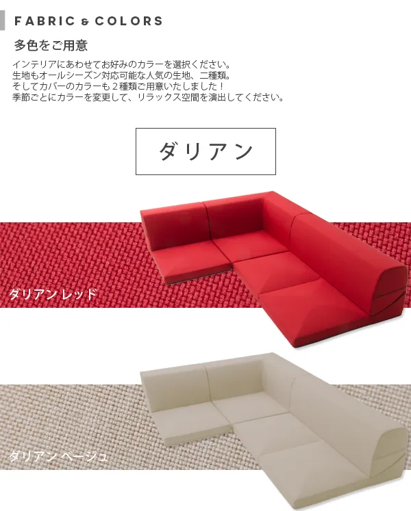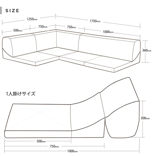 【サイズ】 ソファ時 1P:幅500×奥行750×高さ360 座面の高さ:100mm(一番高いところ) 2P:幅1000×奥行750×高さ360 座面の高さ:100mm(一番高いところ) コーナー:幅750×奥行750×高さ360 座面の高さ:100mm(一番高いところ)