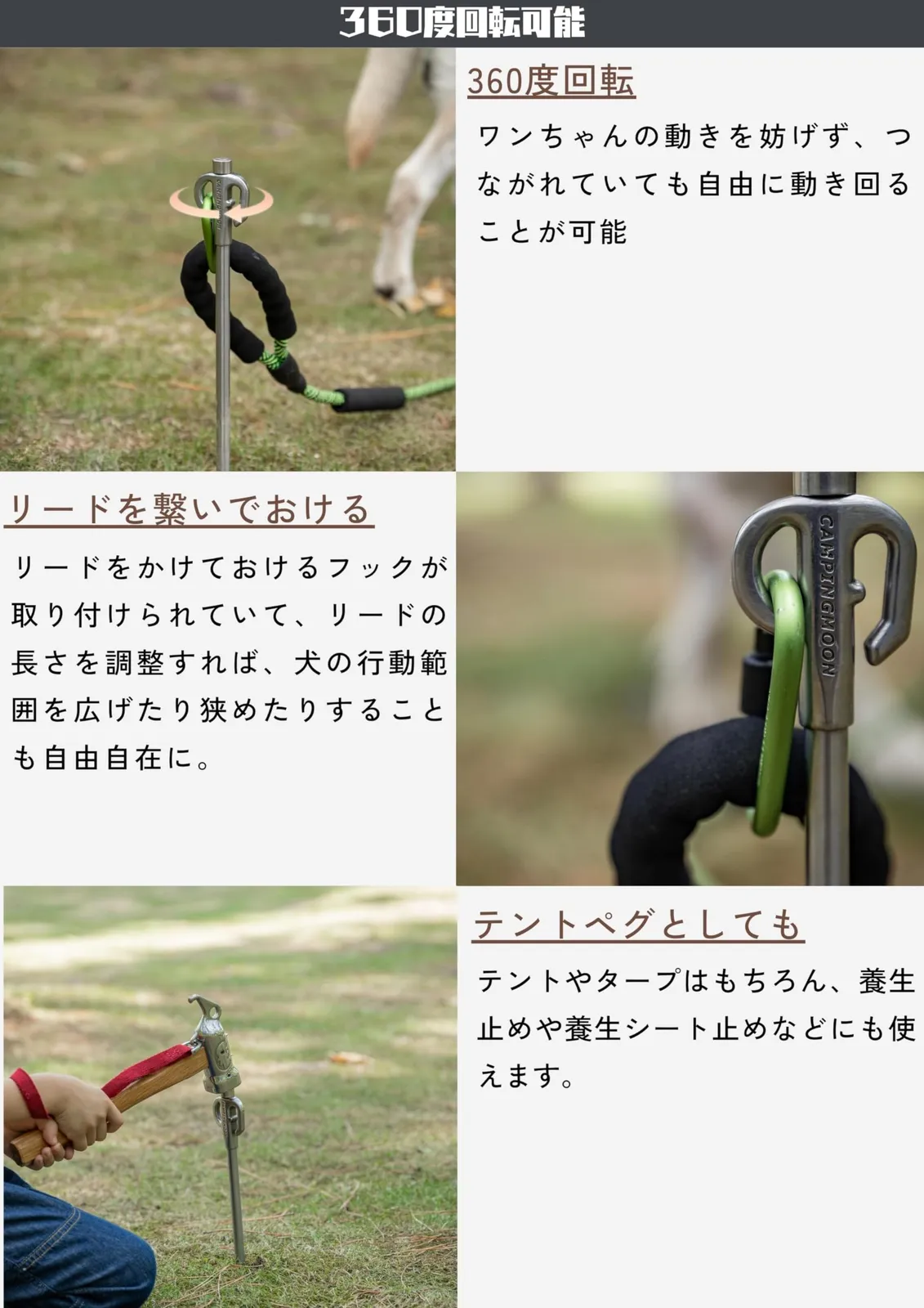 キャンピングムーン(CAMPING MOON) 係留用ポール 係留用ペグ ペット 小型犬用 ステンレス鋼420製 30cm 固い地面にも打ち込める 360度回転 K45-30