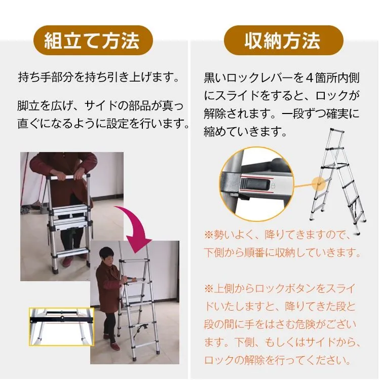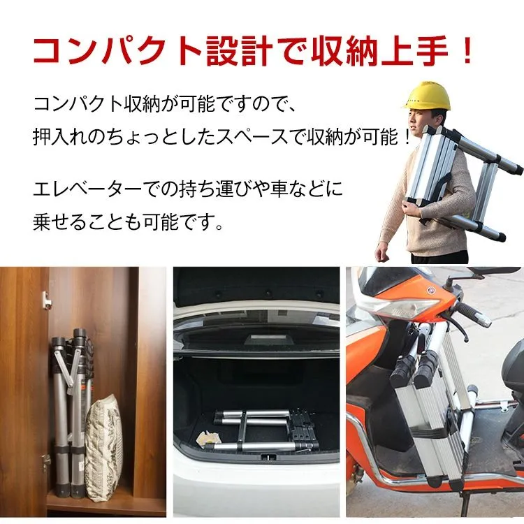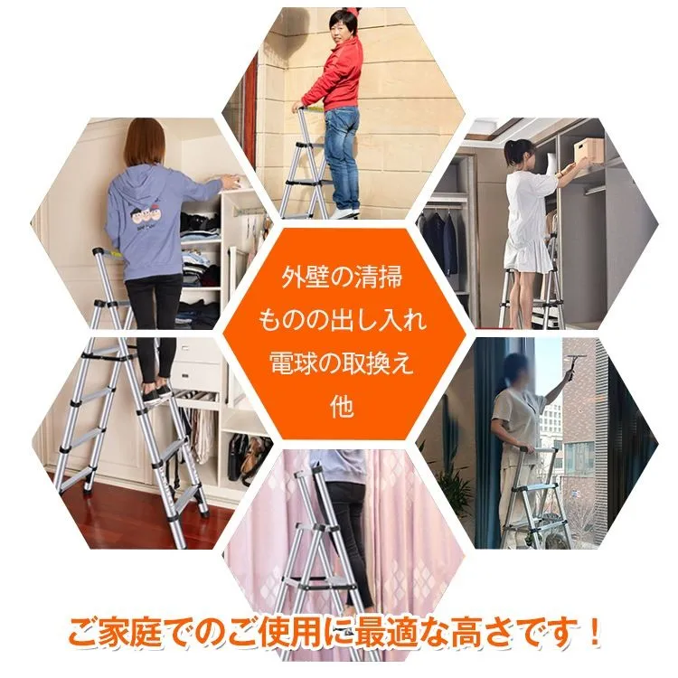 ■外壁の清掃や物の出し入れ、電球の取換えに重宝するサイズ感です。 サイズ 約1.4m×1.7m 収納サイズ 約10cm×47cm×67cm 重量 約7.5kg 使用上の注意事項 ※伸縮時にラダー部分が勢いよく飛び出す場合などがございます。 ※伸縮時に指などを挟まないように注意してください。 ※脚立に上る前に安全確認を必ず行ってください。 ※床が不安定な場所でのご使用はしないでください 。 ※改造/本来の目的以外/強い衝撃などはお控え下さい。 ※仕様は改善の為に予告なく変更する場合があります。 ※ディスプレイ画面等の環境上、写真と実際の商品の色とは多少違う場合がございます。 ※海外輸入商品により、汚れ/ダメージ等がついている場合がございます。 ○以上、ご同意の上ご購入ください!○