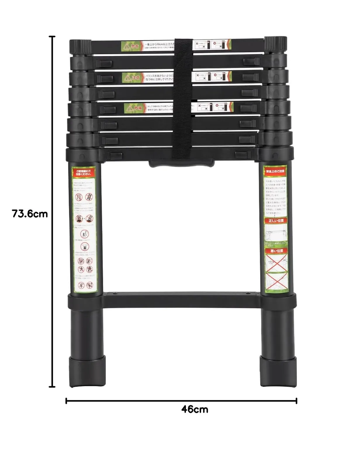 【サイズ詳細】2.6メートルタイプは折り畳み時サイズ(約):幅(足含む)46cm×奥行き7cm×高さ73.6cm 展開時サイズ(約):幅(足含む)46×高さ260cm 階段数量:ステップ9個(最上段を含めて10個)となっており、ステップの幅は各4cmとなっております。 重量:6.85kg 耐荷重:150Kg
