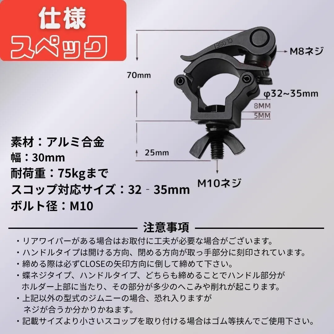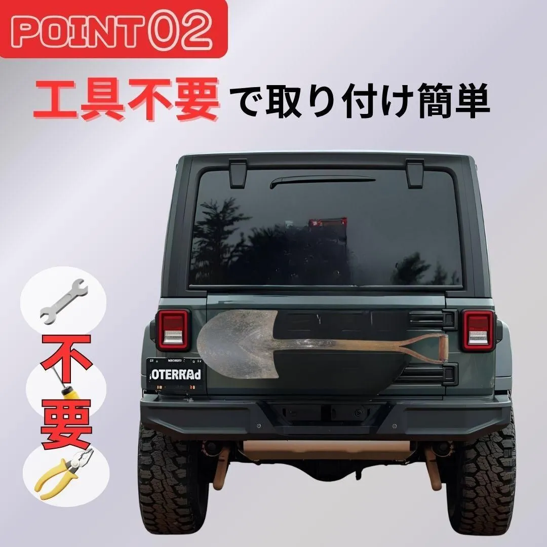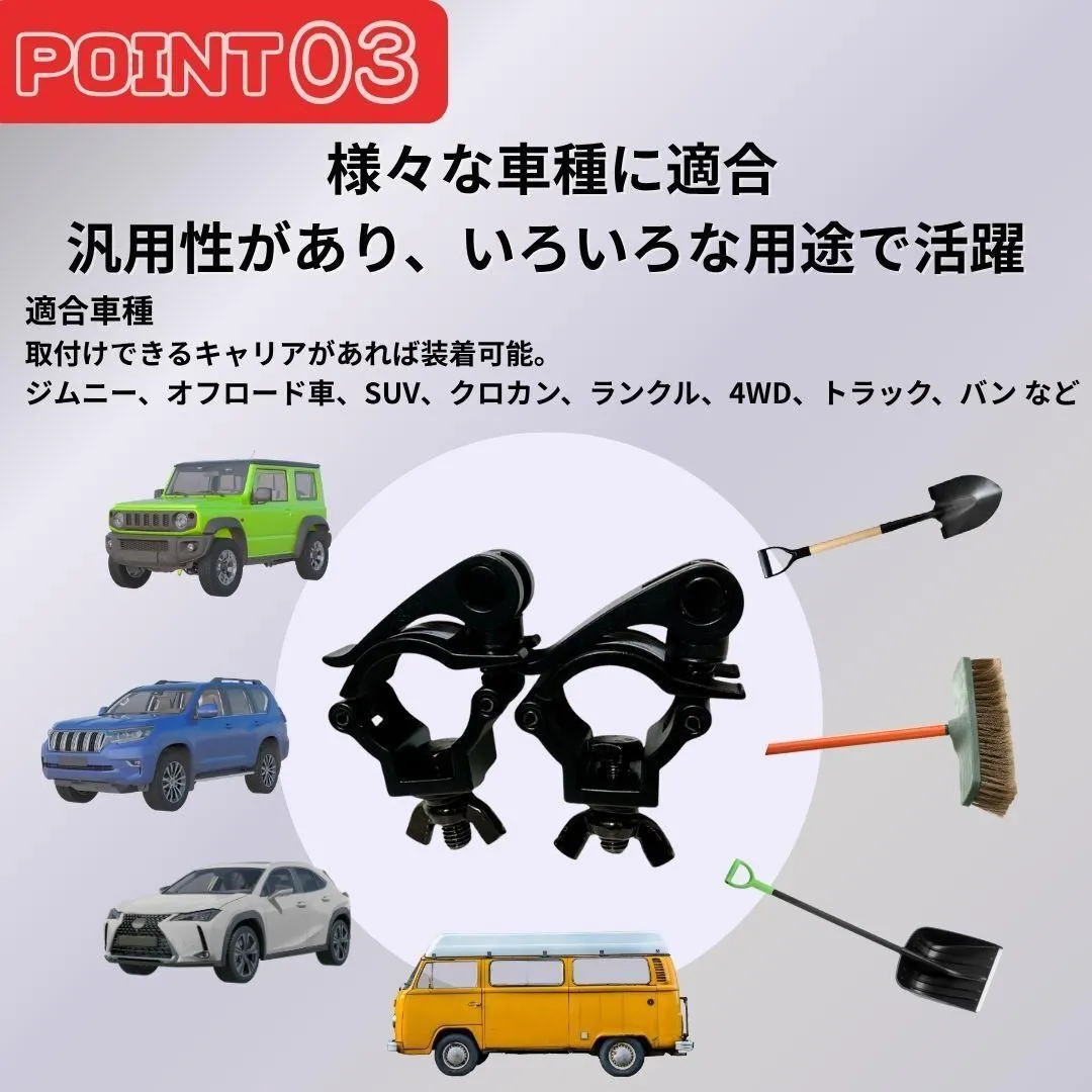 【特徴】 ・外径32mm~35mmのスコップに適合 ・適合車種:ジムニー,JA11,JA12,JA22,JB23,JB64,JB74,シエラ,などなど・・・ *適合車種の他にも取り付け可能な車種が多々ありますので、形状をご確認ください。 ・直接取り付けるため落下の心配が少ない ・重いものでも取り付けできる ★こんな方におすすめ ・アウトドア・キャンプでスコップを車載したい方 ・ガーデニングや農作業で道具の整理に困っている方 ・簡単に取り外せる固定具をお探しの方