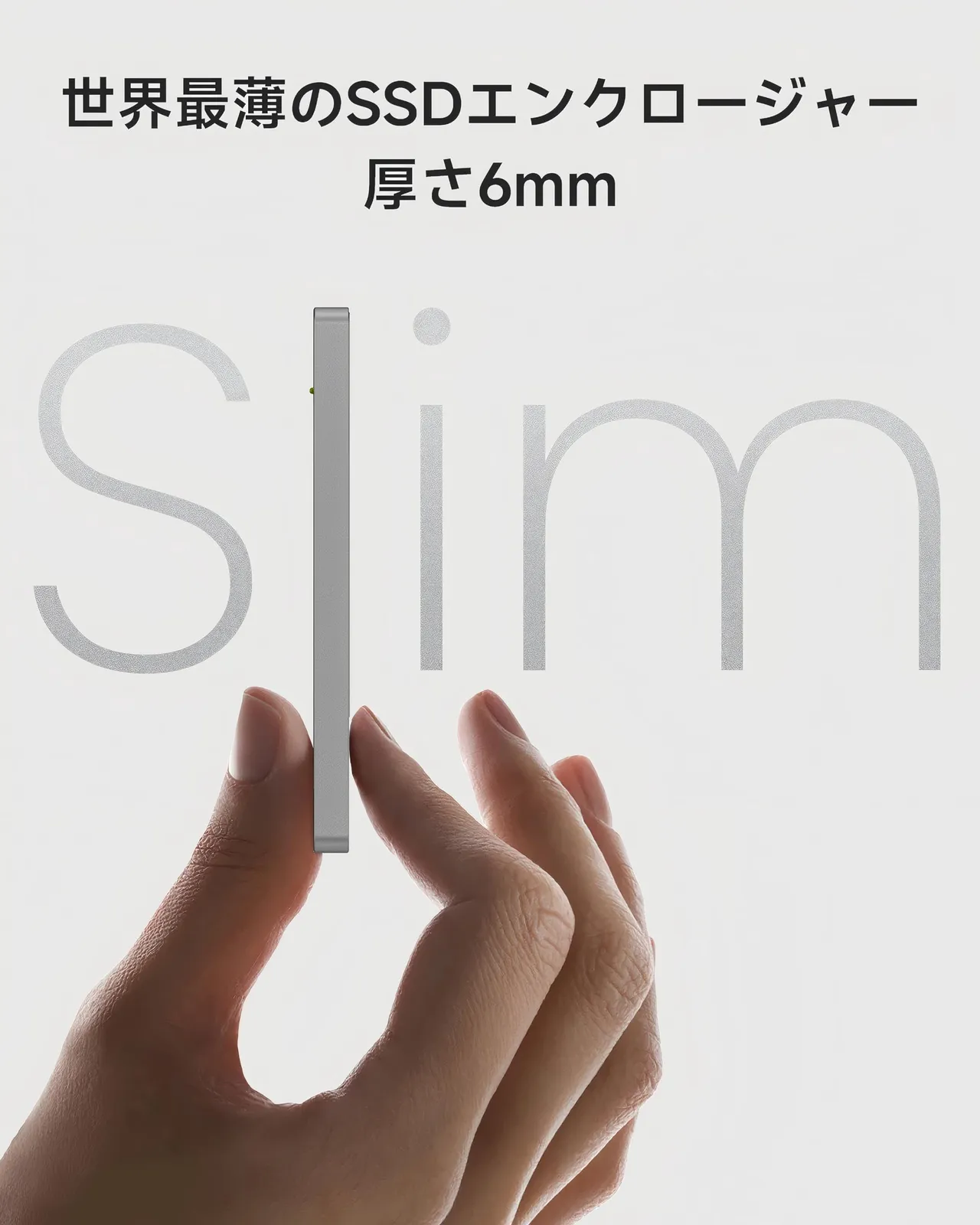 【想像を超える薄さ・6mm極薄デザインで超軽量】わずか6mmの極薄アルミニウムボディは、まるでクレジットカードのようなサイズ感です。iPhoneやGalaxyなどのスマホと重ねても違和感なく、ジャケットの内ポケットや小さなガジェットポーチにもすっきり収納できます。出張・撮影・外出時に、必要なときサッと取り出せる「持ち歩くSSD」です。※SSDは別売です。