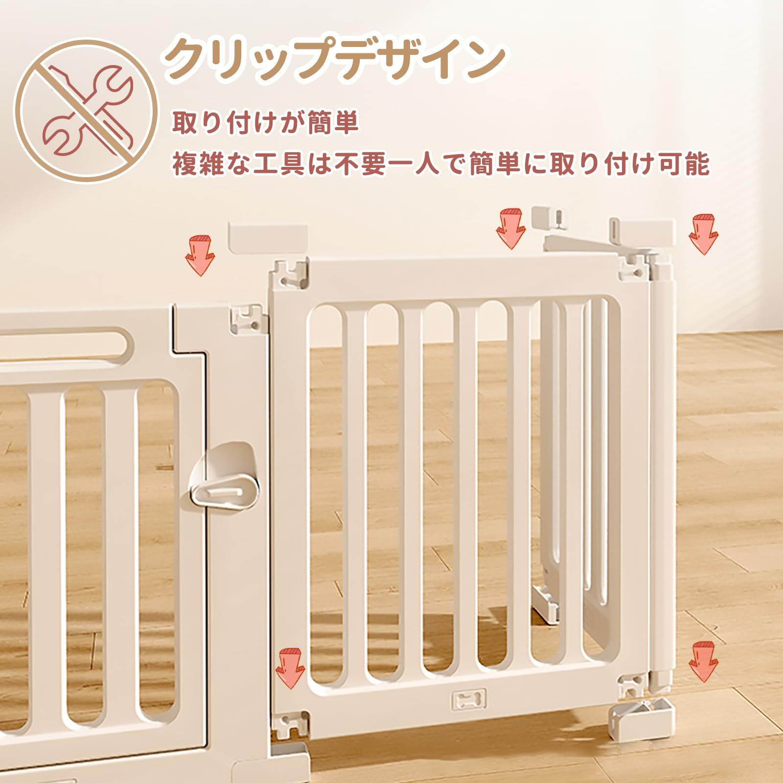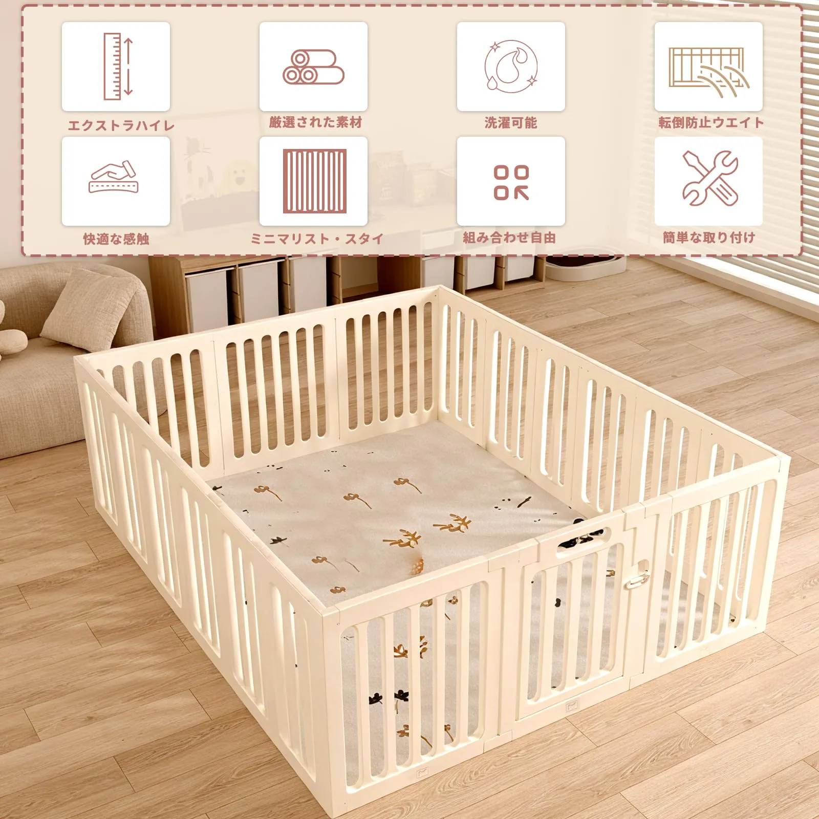 【組み立て簡単】本ベビーサークルは工具不要なのでママ1人でも簡単に組み立てることができます。また、柵には出入り口となる扉が付いており、 外からロックすることで、開閉することができないので、家事などで赤ちゃんから目を離しても安心です。