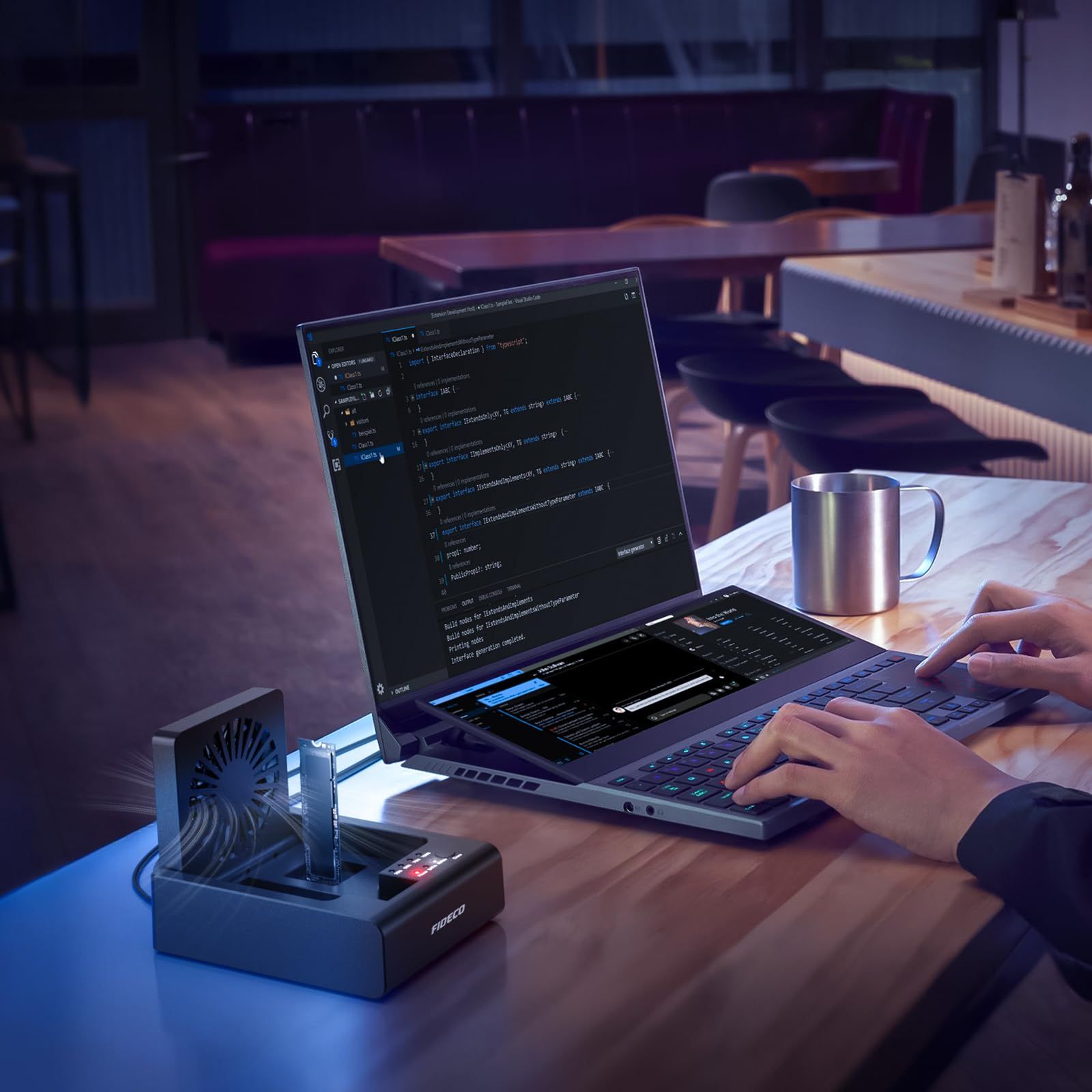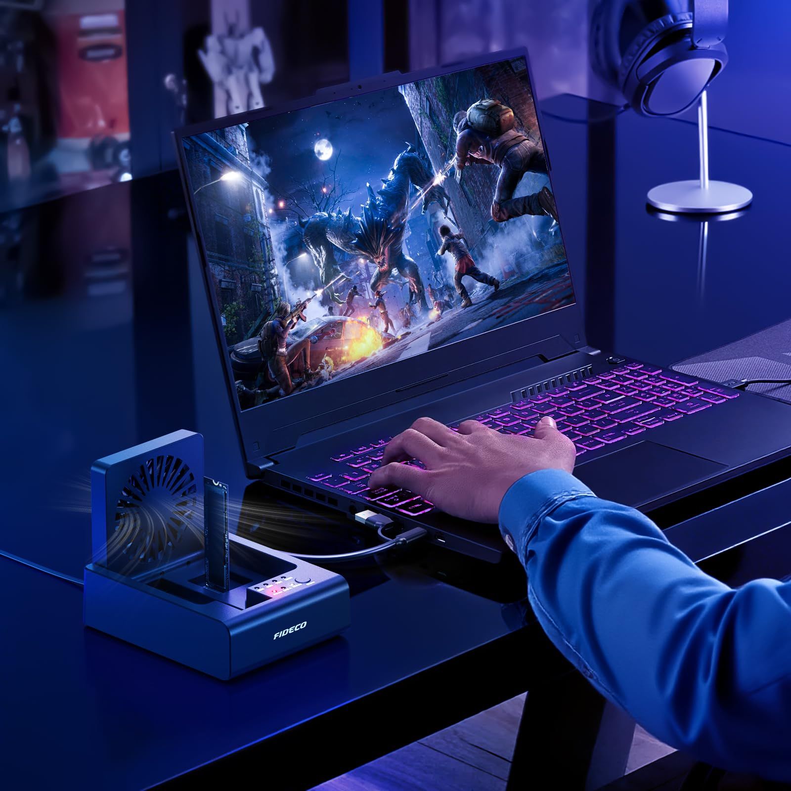 【折りたたみ式冷却ファン】FIDECO NVMe SATA SSDクローナーケースは折りたたみ式の冷却ファンを搭載しており、SSDを冷却し、より涼しい環境に保つことができます。もうSSDの過熱問題を心配する必要はありません。このデバイスは、SSDを冷却することができます。