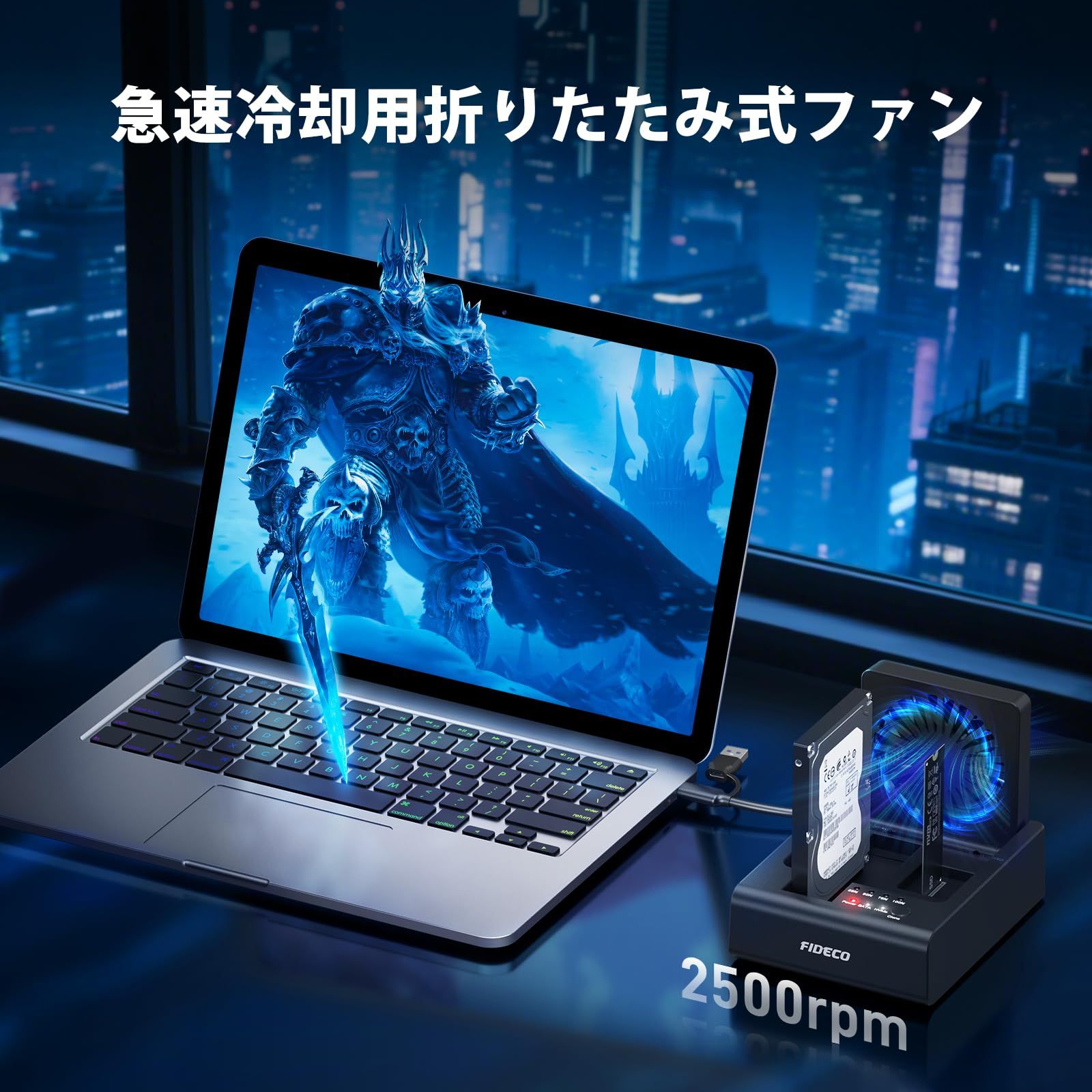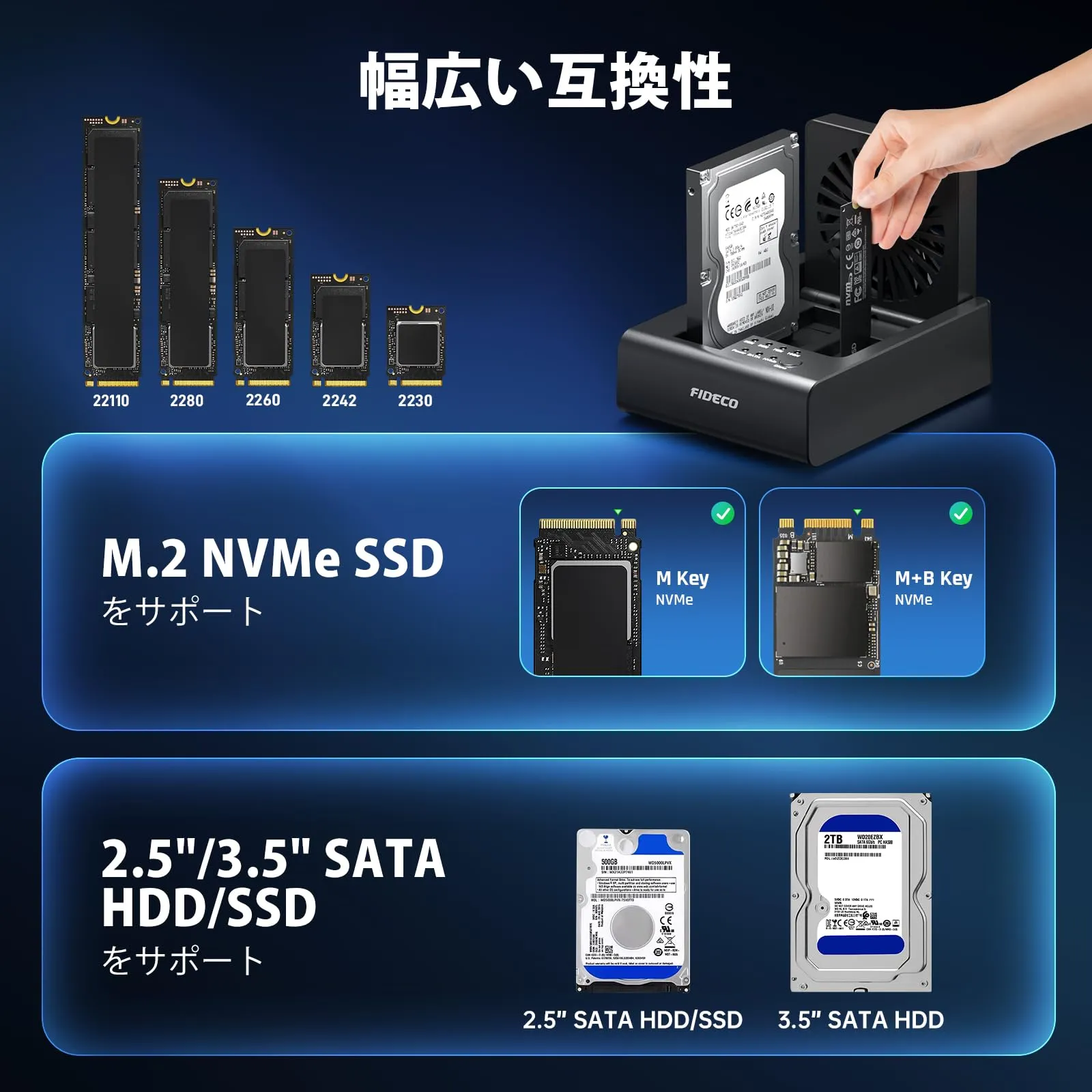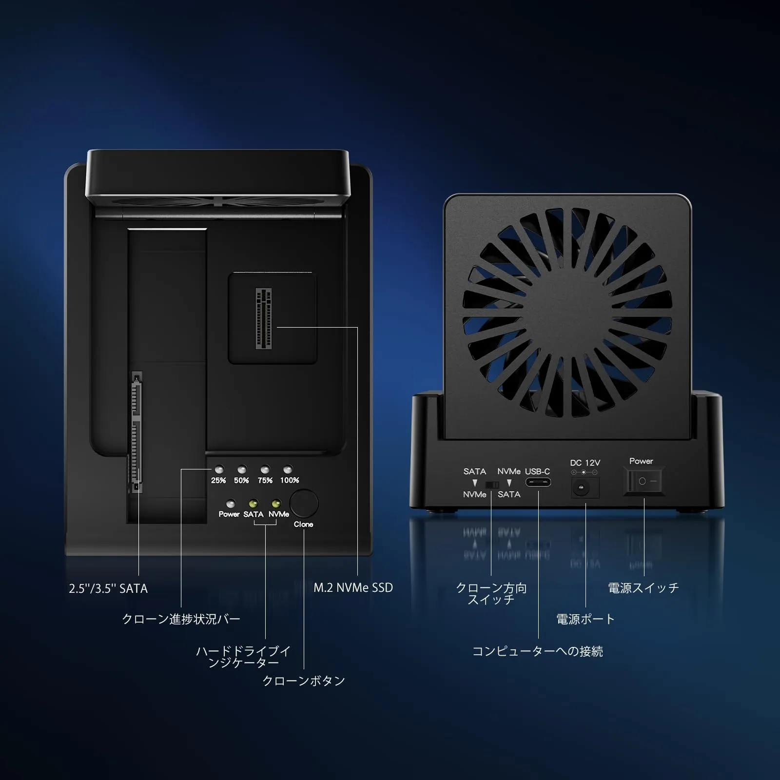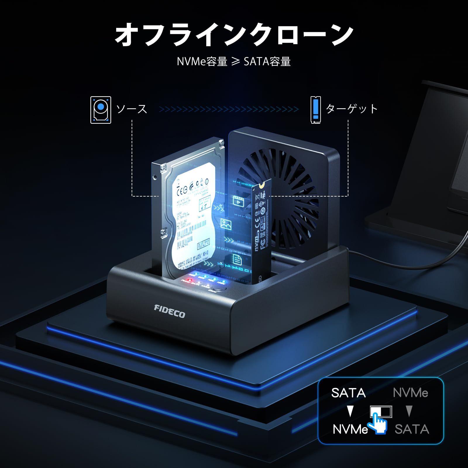 FIDECO USB Cドッキングステーション M.2 NVMe SSD および2.5/3.5 SATA HDD用 クローンドック 双方向オフラインクローン対応 双方向クローンケース M.2 NVMe - USBアダプター 10Gbps デュプリケータ SSDリーダー 折り畳み式冷却ファン付き