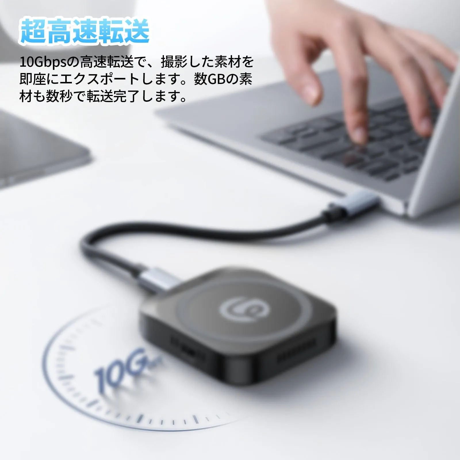 【内蔵冷却ファンを搭載内蔵・コンパクト設計】SSDケース は内蔵冷却ファンを搭載し、アルミニウム合金ボディと組み合わせることで熱を素早く放散し、スムーズで安定したパフォーマンスをします。頻繁に撮影し、より高速なワークフローを必要とするクリエイターに最適です。ポケットサイズのデザインで簡単に収納可能です。超高速データ転送に対応し、出張や旅行中の資料作成やバックアップ、高精細度写真・動画の保存など、幅広い用途で活躍します。
