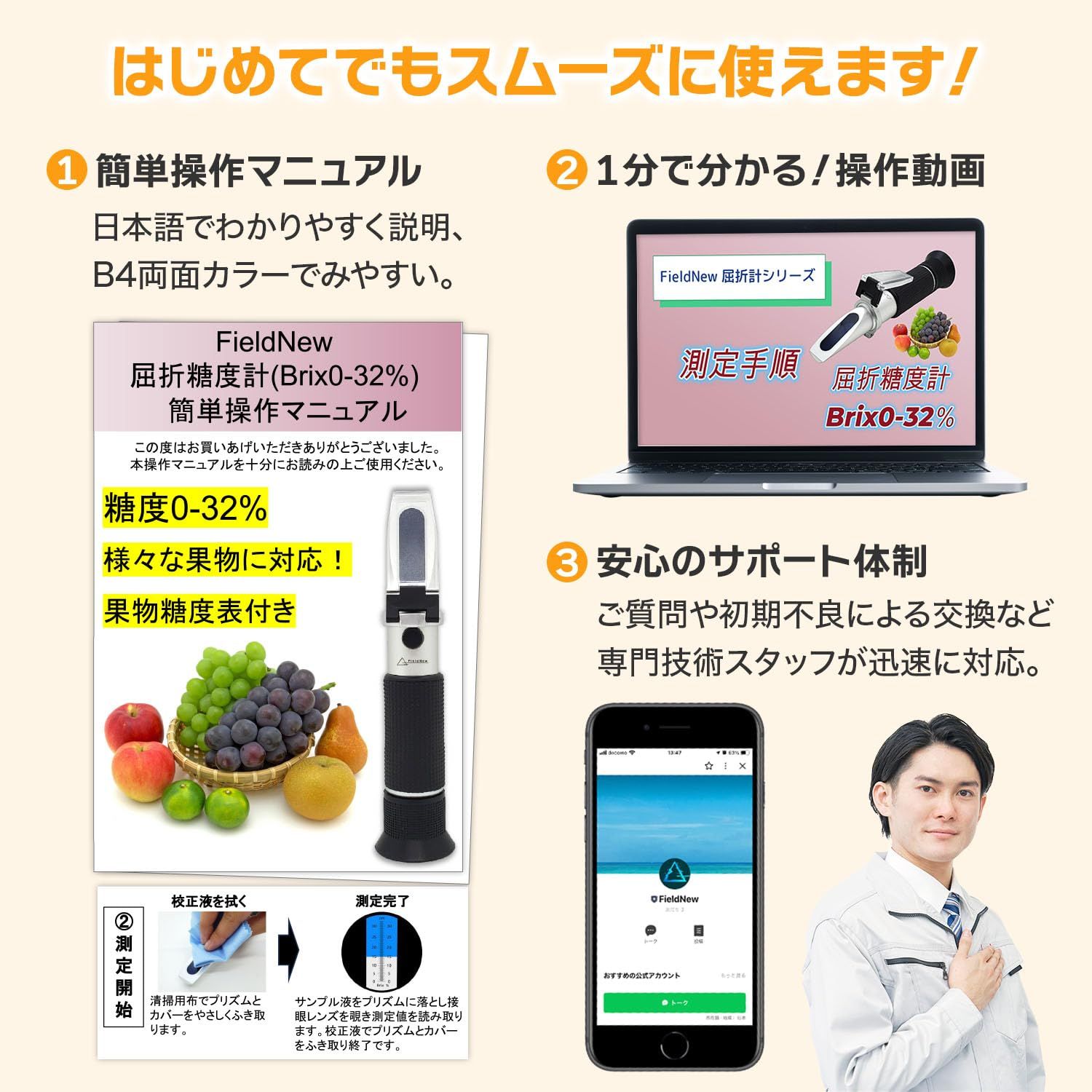 【初めてでも簡単測定】 液をたらしてのぞき込むだけで糖度を測定できます。(1)簡単操作マニュアル、(2)1分で分かる動画説明(3)公式LINEでのサポートで、誰でも簡単に操作できます。